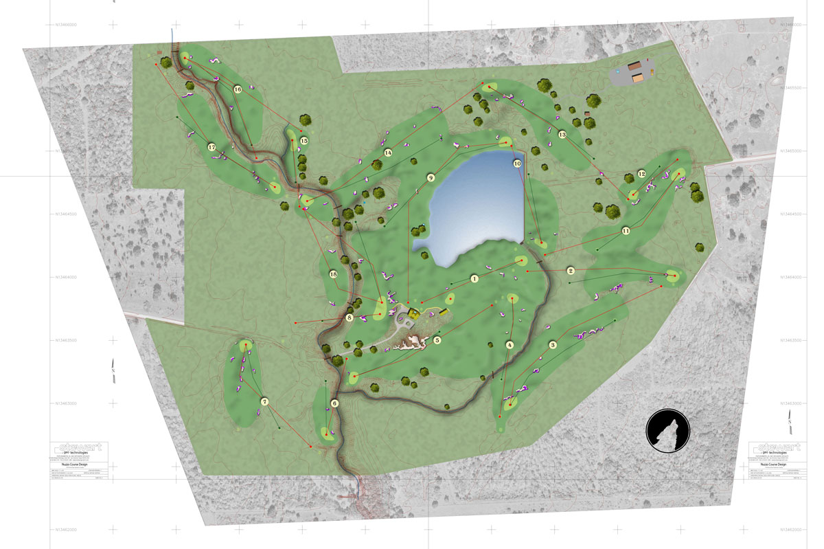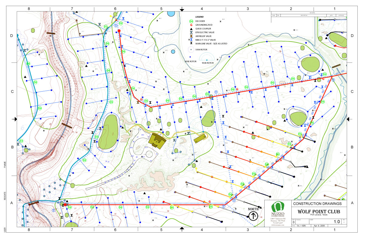 The following plans were all created for the support of the construciton of Wolf Point Club. The 32 page complete set of plans were utilized for irrigation and drainage quantity orders. They were also transferred for use to a hand held GPS unit for accurate installation and take offs. Bidding contractors commented that they had never seen more detailed plans.